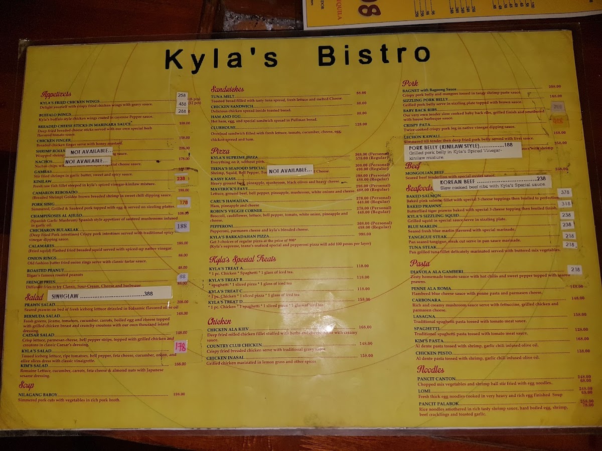 As you explore the menu, you'll find a variety of refreshing fruit shakes, such as the luscious Grape Shake and the creamy Mango Shake. For noodle lovers, the Kyla's Noodles selection features a scrumptious Pancit Canton, stir-fried to perfection with meat and vegetables.